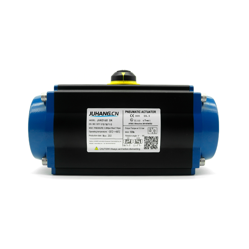 Tá an t -aisteoir neomatach raca agus pinion ag gníomhú go dúbailte JHA0160DA faoi thiomáint ag aer comhbhrúite, agus é á thiomáint ag gluaiseacht dhíreach an raca loine chun tarchur giair na seafta aschuir a thiomáint, agus aschur trí stróc uilleach an ghníomhaire neomatach. Is é an gléas idéalach a úsáidtear go forleathan i gcomhla liathróid, comhla féileacán, comhla breiseán agus lasc comhla stróc eile uillinne agus coigeartú, is féidir é a chur i bhfeidhm ar ócáidí rothlacha eile freisin chun rialú uathoibrithe píblíne tionsclaíoch a bhaint amach.